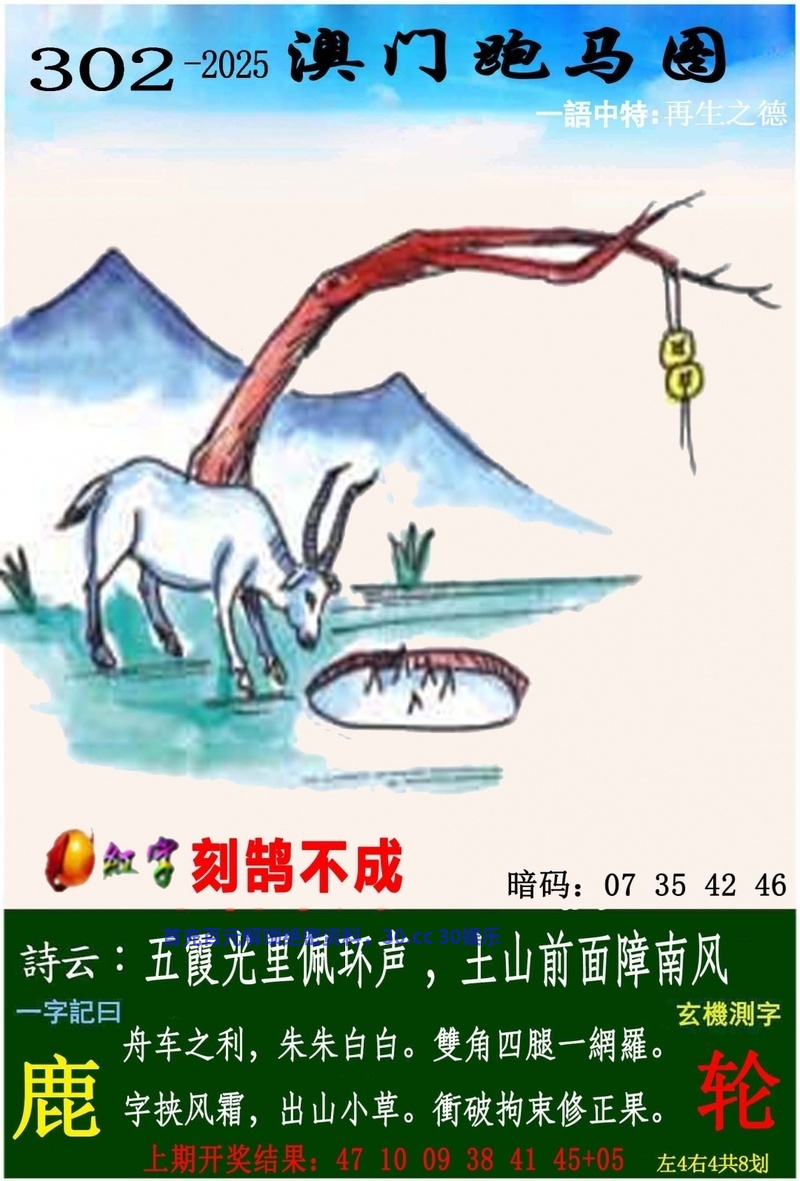 302期一字記曰:【鹿】 舟车之利,朱朱白白。雙角四腿一網羅。字挟风霜,出山小草。衝破拘束修正果。【轮】 解:双角四脚一网罗:双角四脚解双虎马狗猴龙鼠 综合取肖:虎马狗猴龙鼠 |